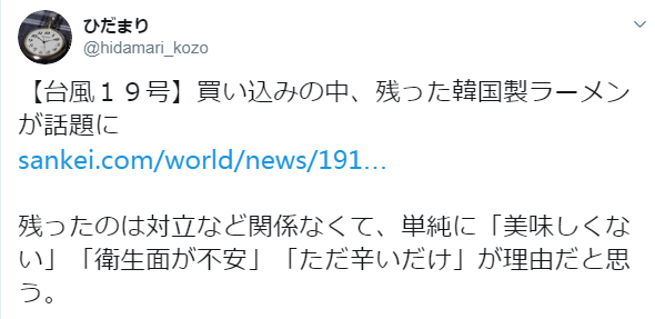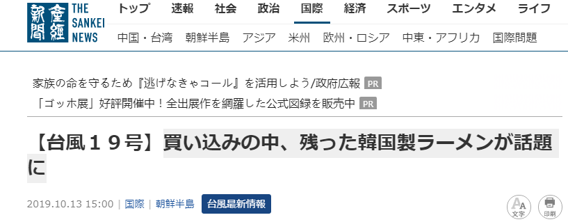 报道称,值得注意的是,“几乎被买空”的超市货架上却剩下了大量的韩国泡面。不仅如此,还有很多韩国品牌的其它货物也无人问津。对于这个现象,《产经新闻》总结称:即使在生命受到威胁的情况下,日本人也坚持不买韩货。