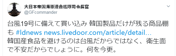 《产经新闻》称,对于此次超强台风登陆日本的消息,韩国也进行了大力度报道。虽然日韩对立愈发严重,许多韩国市民表示,他们祈祷这次台风不会对日本民众造成严重的影响。报道称,虽然一部分韩国网友在网上对日本发起嘲笑,但也有很多网友称“天灾与政治是两回事,这次灾难令人心痛。”