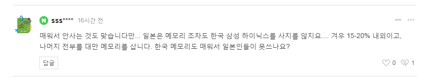 虽然因为辣不买也没问题…但日本连存储器都不买三星海力士的….只购买大约15-20%,其余都从(中国)台湾购买。难道是因为韩国的存储器太辣,日本人没法用?