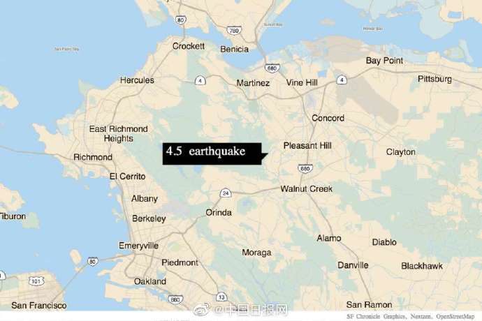 据美国媒体《旧金山纪事报》网站报道,当地时间14日晚上10点33分,加利福尼亚州悦人山(Pleasant Hill)附近发生4.5级地震,整个旧金山湾区有震感。