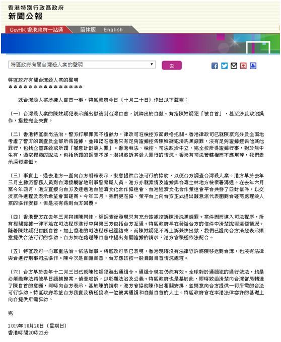 20日晚,香港特区政府声明表示,过去港方一直向台方明确表示,乐意提供合法可行的协助,以便台方调查台湾杀人案。今年三月,港方更在协、策平台上向台方正式提出愿意派代表团到台磋商处理杀人案的协作安排,但是没有得到台方回复。随着陈姓疑犯自愿自首,加上香港的司法程序已经结束,而陈姓疑犯不再上诉兼快出狱,港方已经向台方清楚表示乐意提供合法可行的协助。台方如在处理陈自首中提出有关证据的请求,港方会积极依法配合。