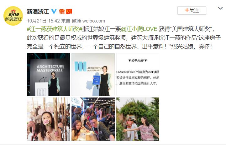 10月21日,微博上有消息称,江一燕获得“美国建筑大师奖”,获奖作品是她参与设计的“梦想家园”。
