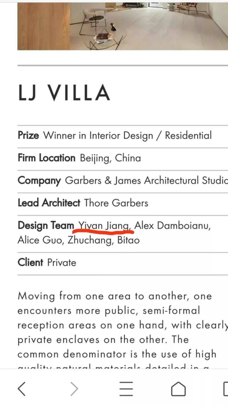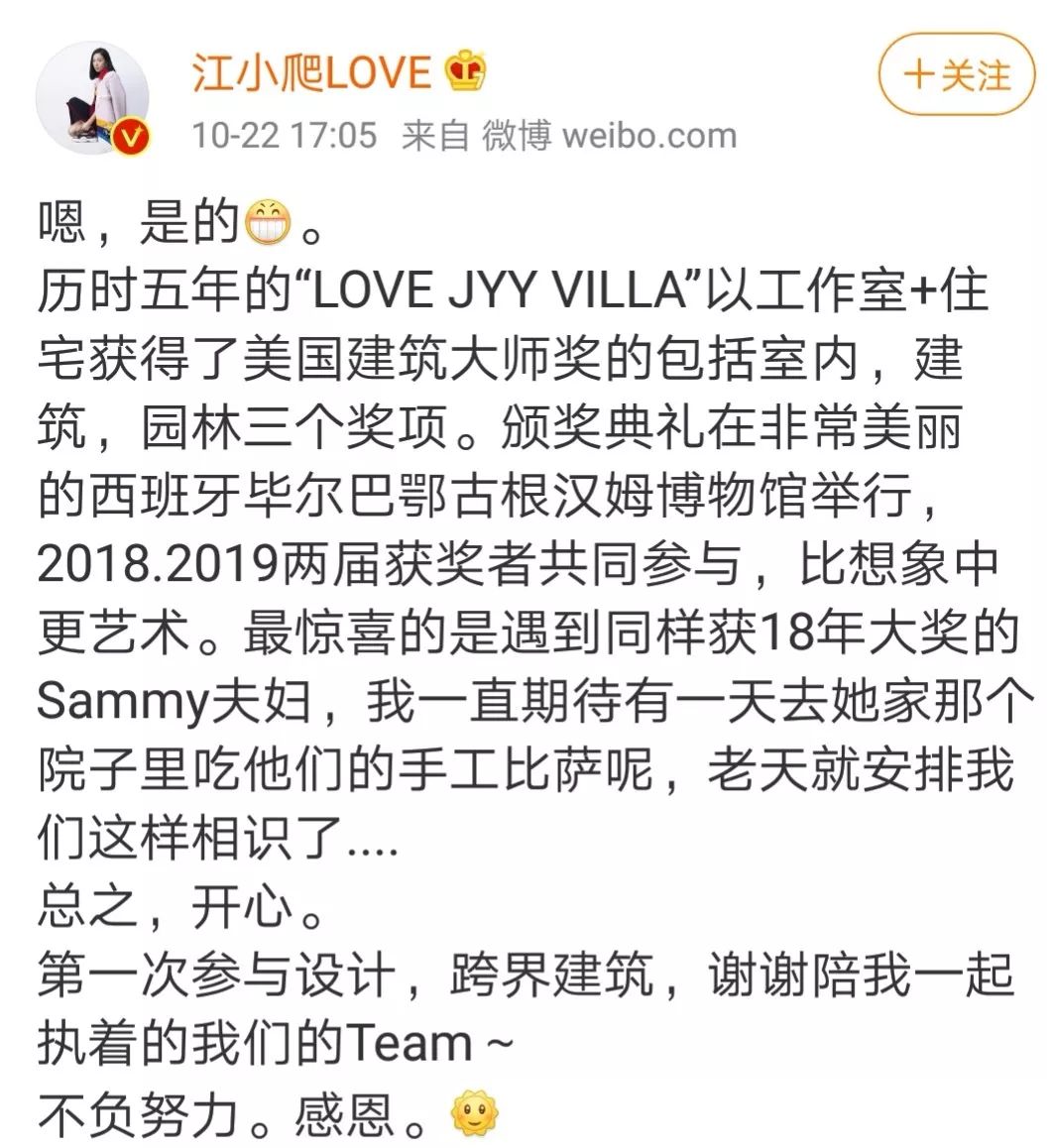 对网友的争议,江一燕也在微博发布两条回应。在第一条中,她表示,这一项目名称为“LOVE JYY VILLA”,获得了美国建筑大师奖的包括室内,建筑,园林三个奖项,并称自己是第一次参与设计。