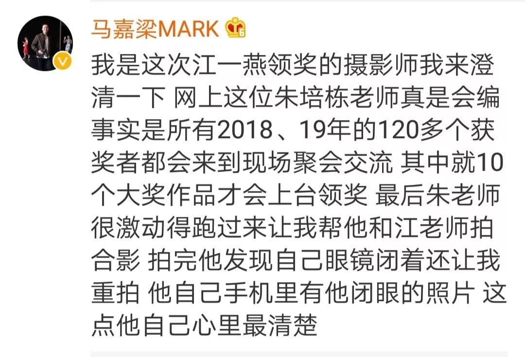 评论中,领奖现场的摄影师也出来澄清,称朱培栋是主动找江一燕合影。