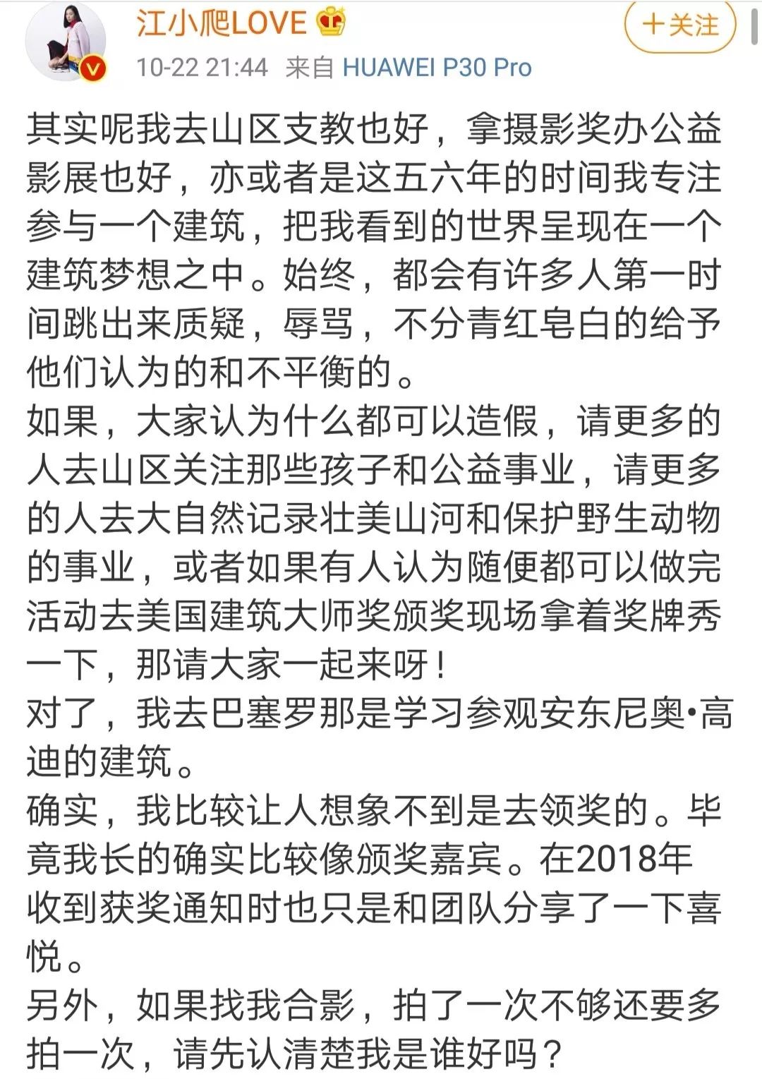 在第二条回应中,江一燕称,自己不管是山区支教还是拿摄影奖办公益影展,亦或是专注参与一个建筑,总会有人质疑。还称自己比较让人想象不到是去领奖的,毕竟她长的确实比较像颁奖嘉宾。在2018年收到获奖通知时,也只是和团队分享了一下喜悦。