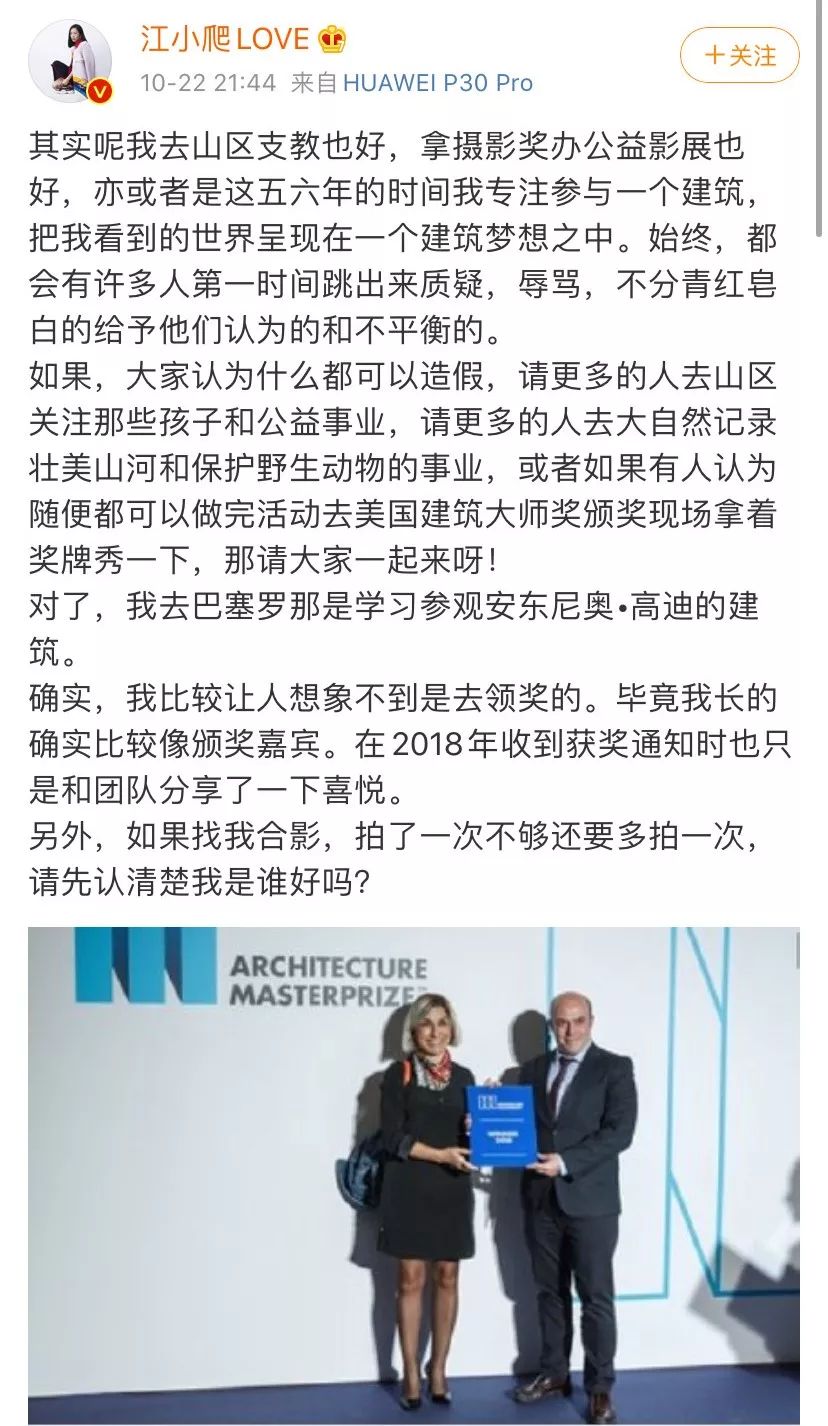 对于这些质疑声音,10月22日晚,江一燕发表长文,回应“美国建筑大师奖造假”一事,称自己这些年除了在山区支教,一直在专注参与一个建筑,把看到的世界呈现在一个建筑梦想之中。