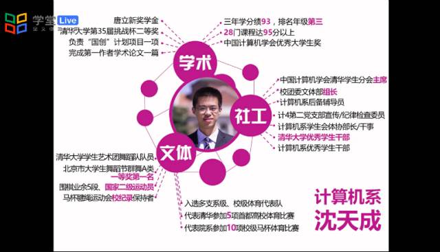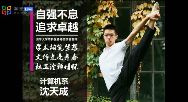 沈天成是清华大学学生艺术团舞蹈队的骨干队员,向美而行的路上,每一次痛苦摔倒和精益求精都是自强不息的深刻理解;纵横赛场,他用小小的毽子打开运动的大门,在2016年同时打破单脚踢毽、双脚盘踢、三人踢毽三项校纪录,为做好计算机系学生会体协的工作,还把自己变成了学校赛事数据“行走的活字典”;参与社工,他始于热情,继于责任。