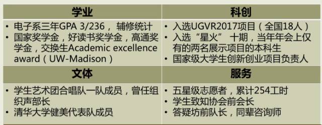 前三年推研成绩班级第一,曾任人文学院人文6班长、本科生课程咨询委员会委员、清华大学学生会学习部副部长。获得国家奖学金、社会工作优秀奖学金、人文学院院长奖学金、英华学者奖学金、大成国学奖学金。担任中国发展研究基金会“中美关系课题组”研究助理,参与中美关系的研究并撰写报告;作为清华大学“英华学者”前往牛津访学。