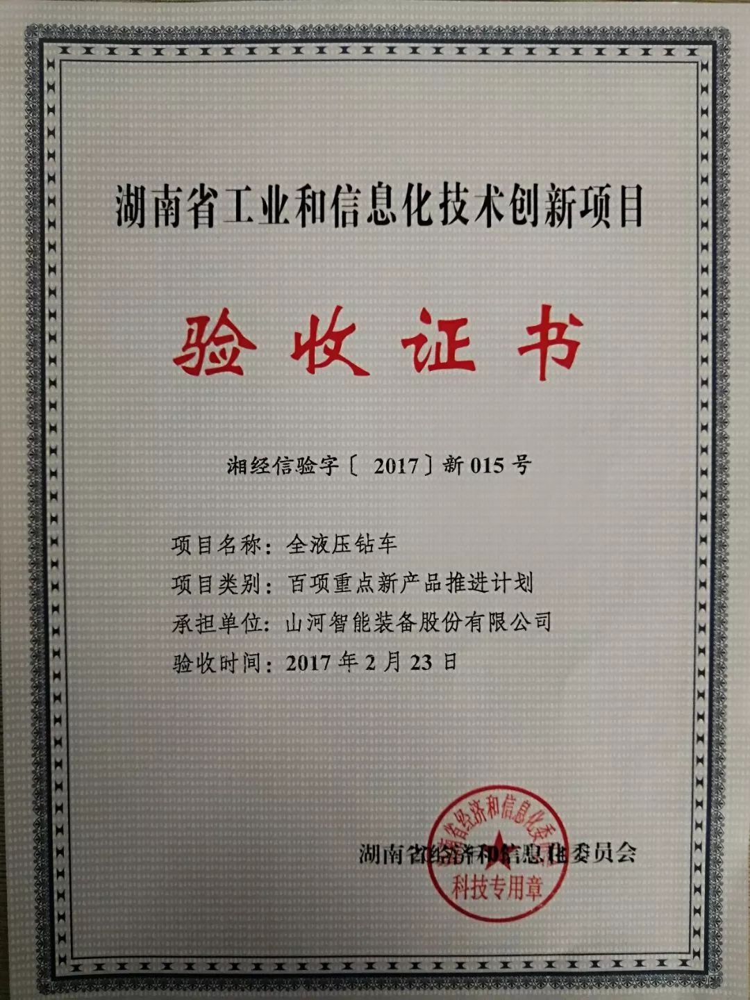 2015年4月13日,“高性能螺旋地桩钻机研制及产业化”项目获批湖南省经信委2015年全省工业领域“百项重点新产品推进计划”重点新产品研发项目。