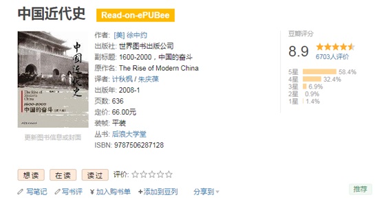 85后的程序员JULY则表示,豆瓣评分是他购书的重要依据。“通常豆瓣上评分如果低于7.5分,可能就不会买了。”但如果豆瓣上分数比较高,JULY还要再看看评论里是否有专业人士力推,以及作者的背景和立场如何,JULY说,“讲中国近代史的书有很多,我从豆瓣里了解到徐中约的视角会比较有意思,就购买了徐中约的《中国近代史》”。