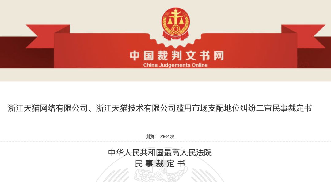 10月14日,中国裁判文书网发布一则内容,主题是《浙江天猫网络有限公司、浙江天猫技术有限公司滥用市场支配地位纠纷二审民事裁定书》,最高法二审驳回了天猫“案件应由浙江省高级人民法院审理”的主张,认定北京市高级人民法院对此案有管辖权。