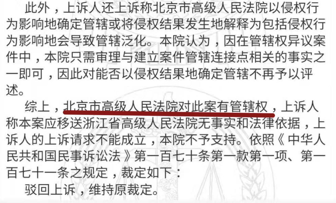 2017年,北京市高级人民法院一审驳回天猫法院管辖权异议,天猫不服提出上诉。
