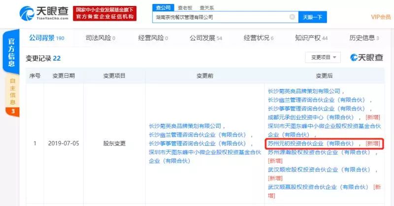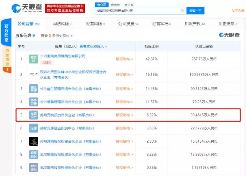 聚天眼查数据显示,茶颜悦色的运营主体,湖南茶悦餐饮管理有限公司发生工商变更,苏州元初投资合伙企业(有限合伙)成为新增股东,持股6.32%。苏州元初投资合伙企业(有限公司)的股东之一为杭州阿里巴巴创业投资管理有限公司。