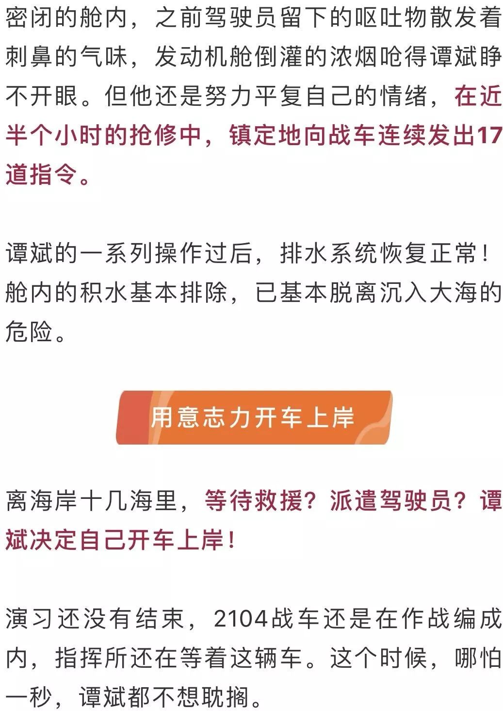 数小时后,谭斌在医疗帐篷里艰难地睁开眼睛,还念念不忘战车。之后才慢慢回忆起来,战车已被自己救上了岸。