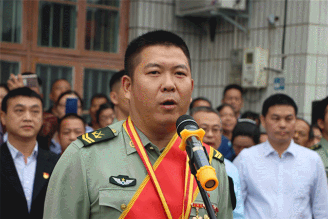▲谭斌的先进事迹被广大官兵知悉后,纷纷表示要向他学习。图为旅领导在旅大门口亲自迎接这位功臣。