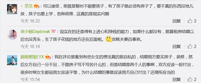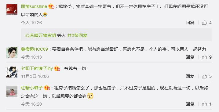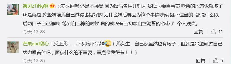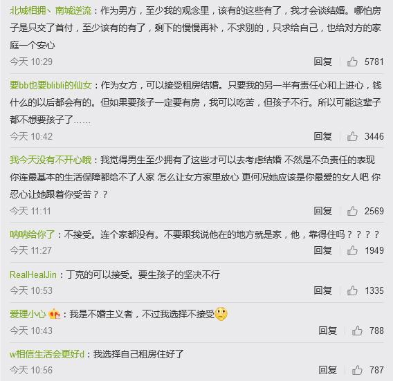 通过网友们的热烈讨论可以看出,是否接受租房结婚的确是因人而异,而男生和女生之间的看法也有较大差异,有的人认为应该有充分的物质基础才会考虑结婚,有的人则表示可以通过两人共同奋斗买房,还有很多看法在此不一一列举。