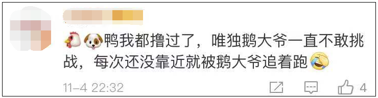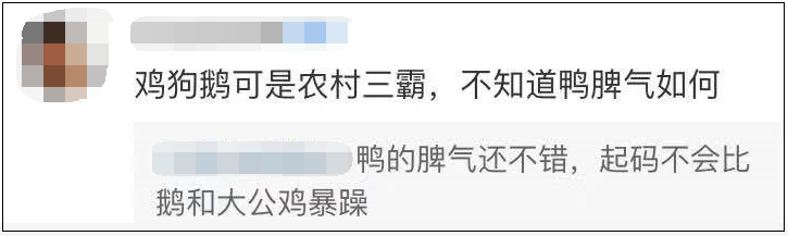 还有网友担心,鸡和大鹅攻击力都那么强,鸭子的脾气应该也不小吧……