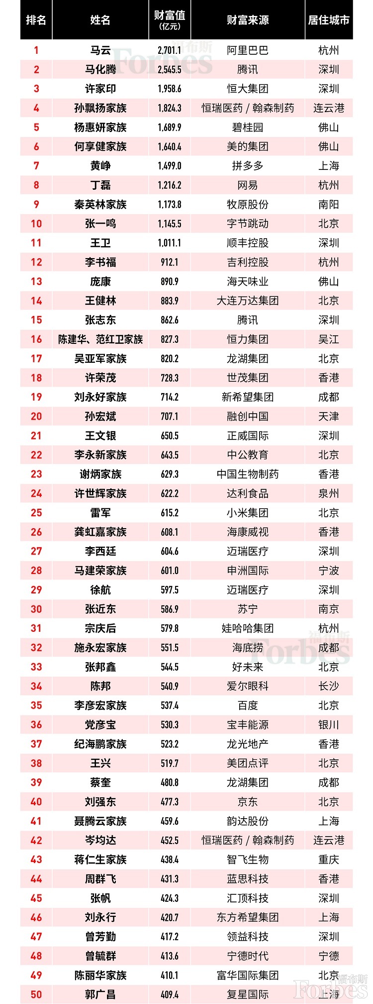 中新经纬客户端11月7日消息,据福布斯中国网站消息,福布斯7日发布2019年度中国富豪榜,共400位中国富豪上榜。马云以2701.1亿元的财富值蝉联榜首;马化腾排名第2位,身家为2545.5亿元;许家印排名仍为第3位,身家为1,958.6亿元。