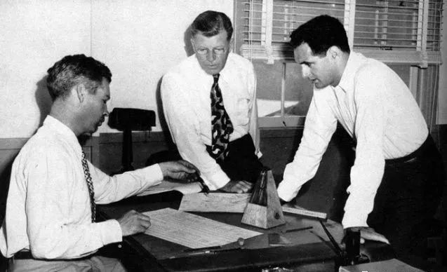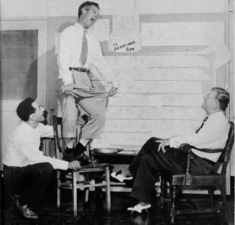 制片人Fred C. Quimby(中)跟威廉·汉纳(左)和约瑟夫·巴伯拉(右)在讨论一部彩色动画的想法