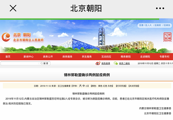11月12日晚间,北京市朝阳区卫生健康委的一份官方通报显示,2019年11月12日,内蒙古自治区锡林郭勒盟苏尼特左旗2人经专家会诊,被诊断为肺鼠疫确诊病例。目前,患者已在北京市朝阳区相关医疗机构得到妥善救治,相关防控措施已落实。