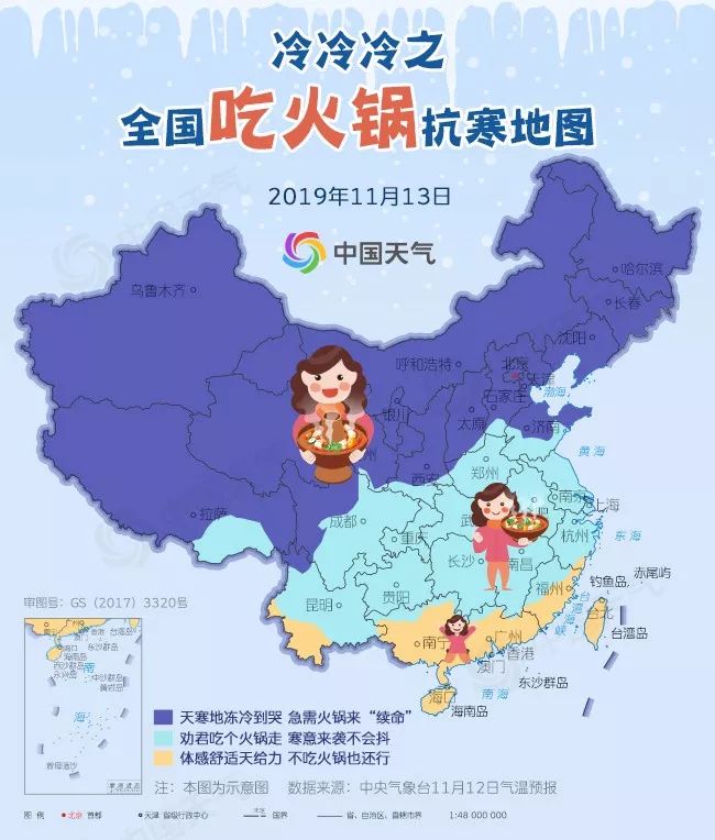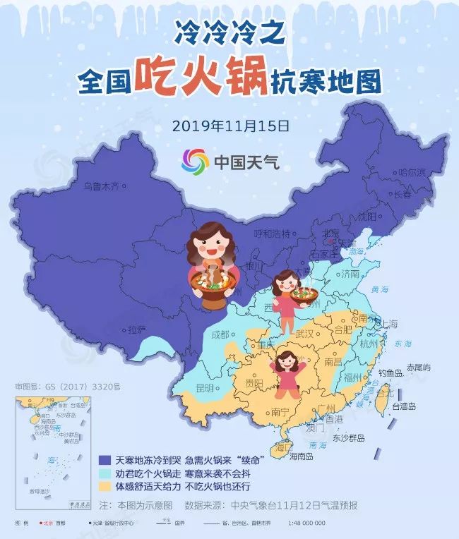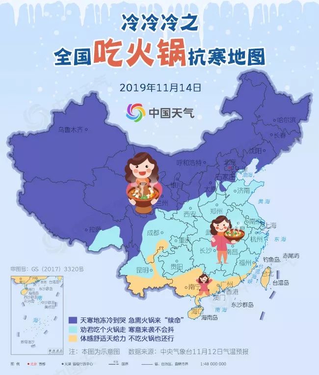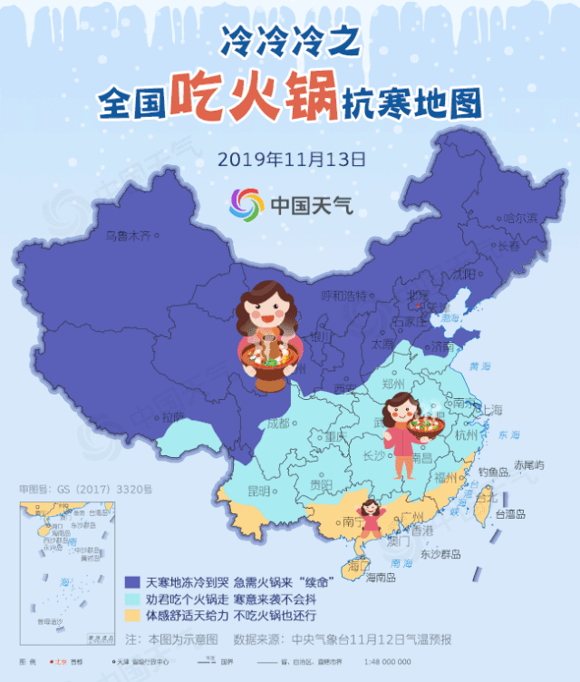 今天开始,许多地方气温就顶不住了,冷到怀疑人生。像是长春、沈阳、呼和浩特、北京、石家庄等地,相比12日,今天最高温跌幅均在11℃以上,哈尔滨、长春、呼和浩特全面降温到冰点以下,从秋阳暖暖局面直接跌入“冰窖”,再加上大风肆虐,体感是嘎嘎冷,说抱着火锅跑也不为过,急需火锅来“续命”,东北多地还将飘雪,下雪天吃火锅简直是绝配;江南、黄淮、西南一带今天则有“透心凉”的赶脚,宜约上三五好友组团吃火锅,以免冷到发抖,来顿火锅可让体不寒。