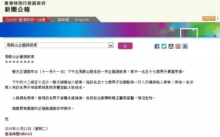 香港特区政府12日零时44分发布新闻公报,称警方正调查这宗企图谋杀案。