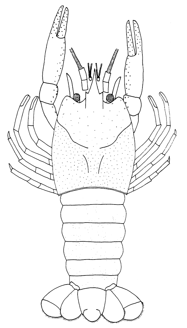 桑氏古蝲蛄轮廓图。前述“小龙虾”、古蝲蛄位于一个矢部龙(Yabeinosaurus)标本化石的胃部。该标本在辽宁省建昌县喇嘛洞地区下白垩统九佛堂组地层被发现。英良石材自然历史博物馆征集到这件标本时是蒙板未清修状态,在该馆旗下的化石矿晶清修复原实验室技术人员的处理下,“小龙虾”巨大的螯足最先从矢部龙胃部暴露出来。