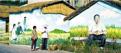 袁隆平团队的到来,让长虹这个原本沉寂的山村热闹起来。人们在一片花海上,用草扎了几只巨型的蚂蚁,还在公路边的民房上绘制了一幅幅表现袁隆平及其团队开展稻田科研的五彩墙绘。
