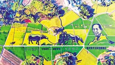 今年夏天,他们运用彩色稻技术,在200亩的稻田“画布”上绘制了巨幅的袁隆平画像,同时还用彩色稻把大足石刻经典的《牧牛图》画面“种”在了大地上。