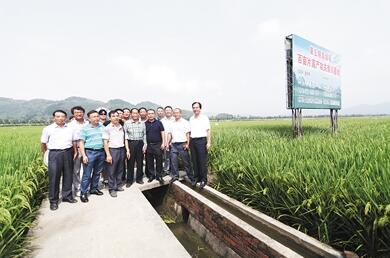袁隆平院士检查指导超级稻高产攻关示范片。