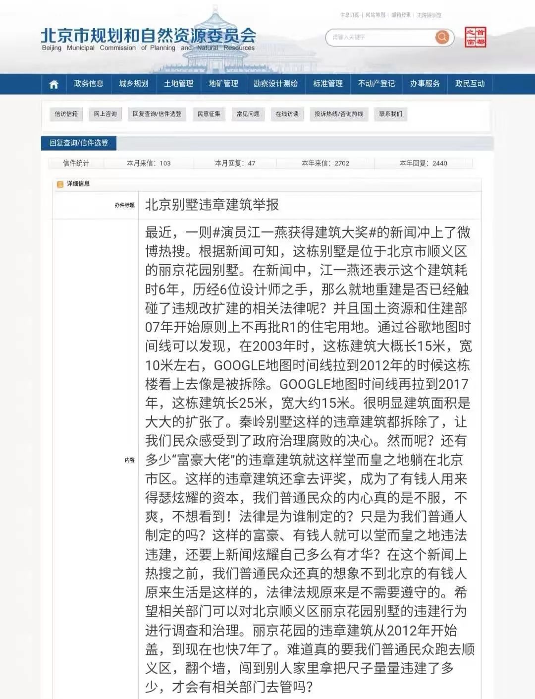 最近,这件事又有了新进展。有网友向北京市规划和自然资源委员会举报,江一燕获奖别墅或涉嫌违规改扩建。