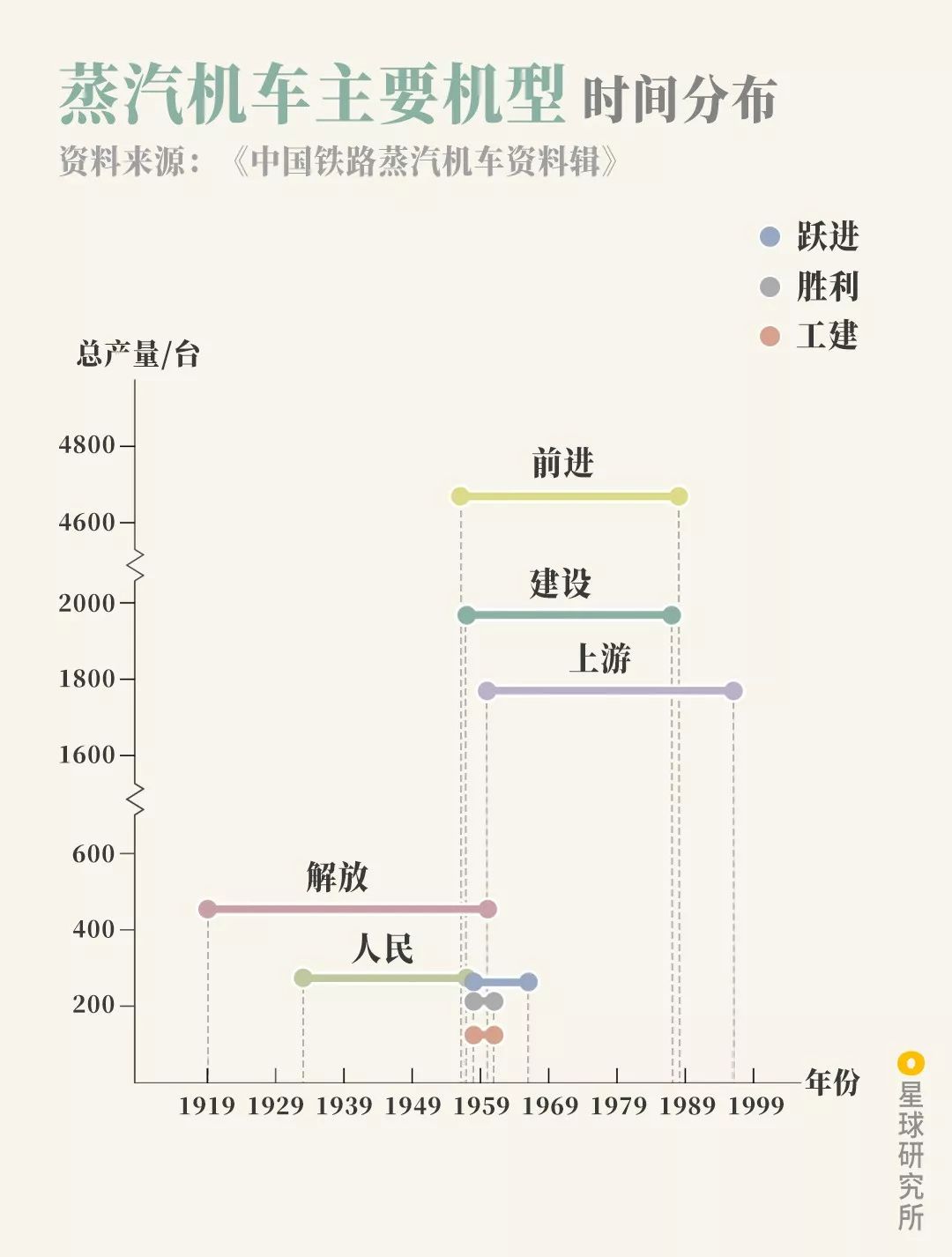 新中国建立以来,建造的主要蒸汽机车型号时间分布,制图@陈睿婷/星球研究所
