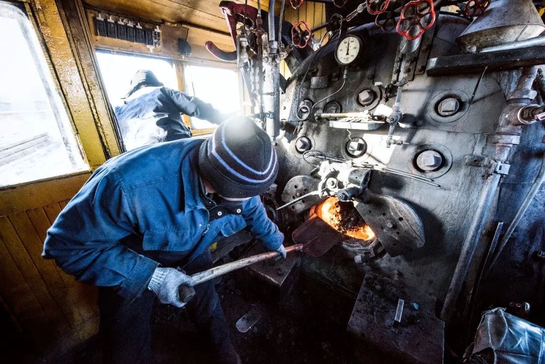 内蒙古自治区呼伦贝尔市牙克石市五九煤矿,司炉把煤炭从煤水车内一铲一铲送入炉膛。