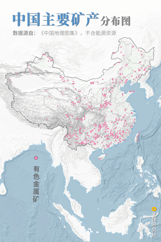 中国有171种矿藏遍布各地,许多储量都居于世界前列,是全球自然资源最丰富的国家之一。中国主要矿产分布图,制图@王朝阳&张靖/星球研究所