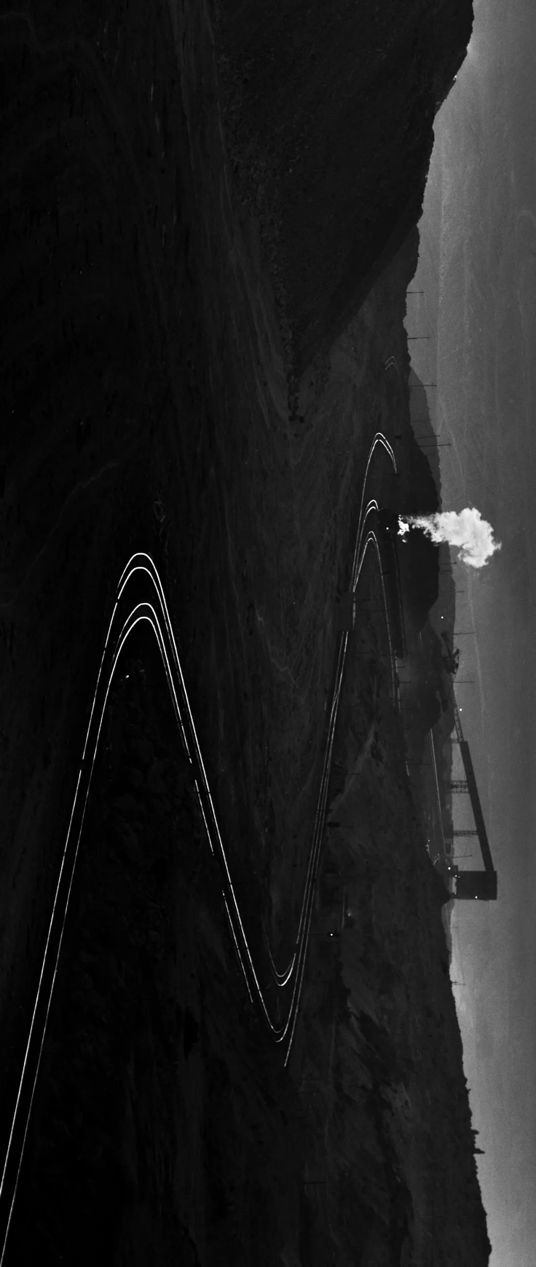 请横屏观看,2015年2月,新疆哈密市三道岭镇,建设型蒸汽机车从露天矿坑下自远处开来,蜿蜒的铁路就像是时间的河流淌。