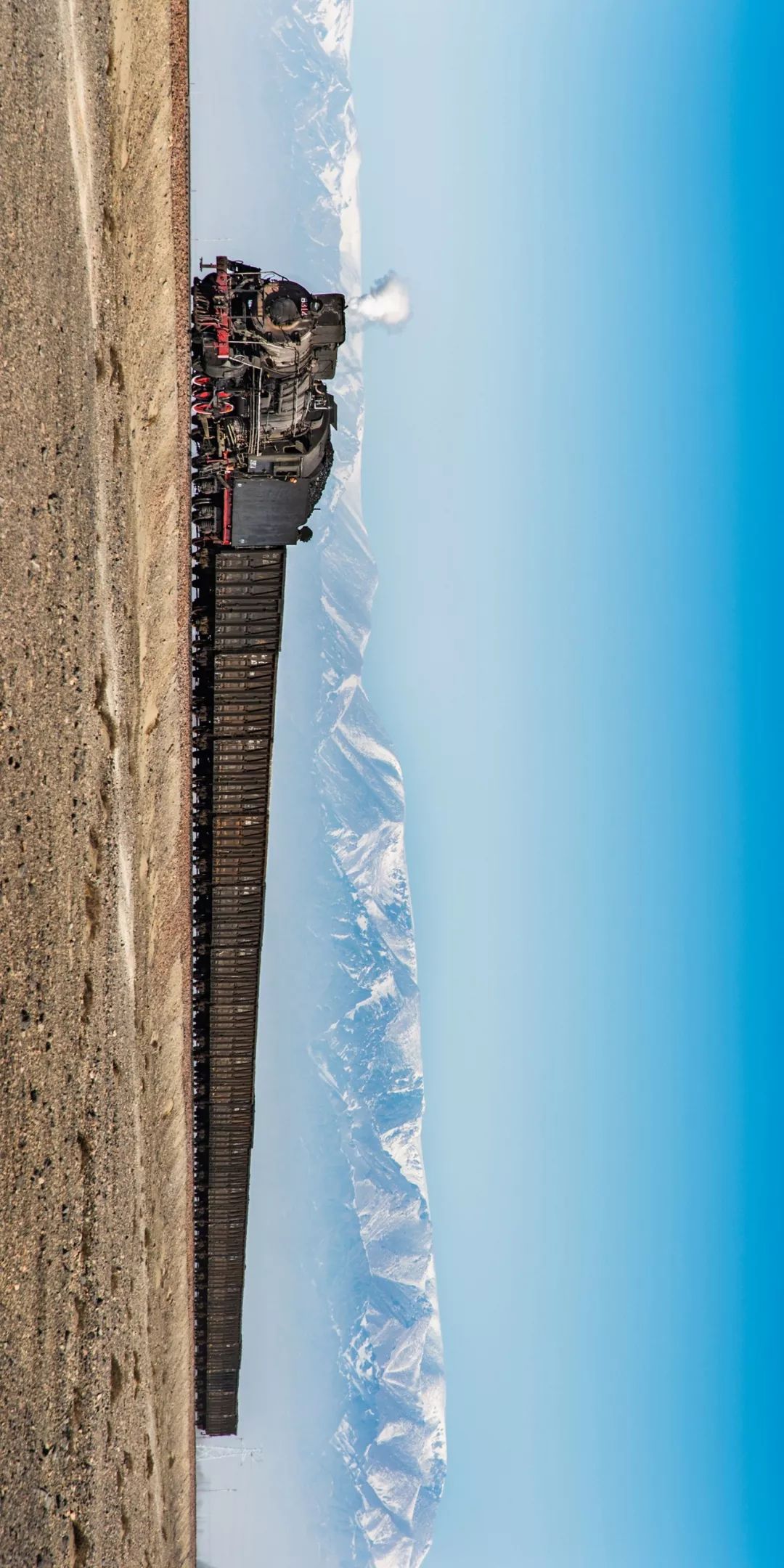 请横屏观看,新疆维吾尔自治区哈密市三道岭煤矿,建设型牵引煤炭敞车行驶在戈壁滩上。