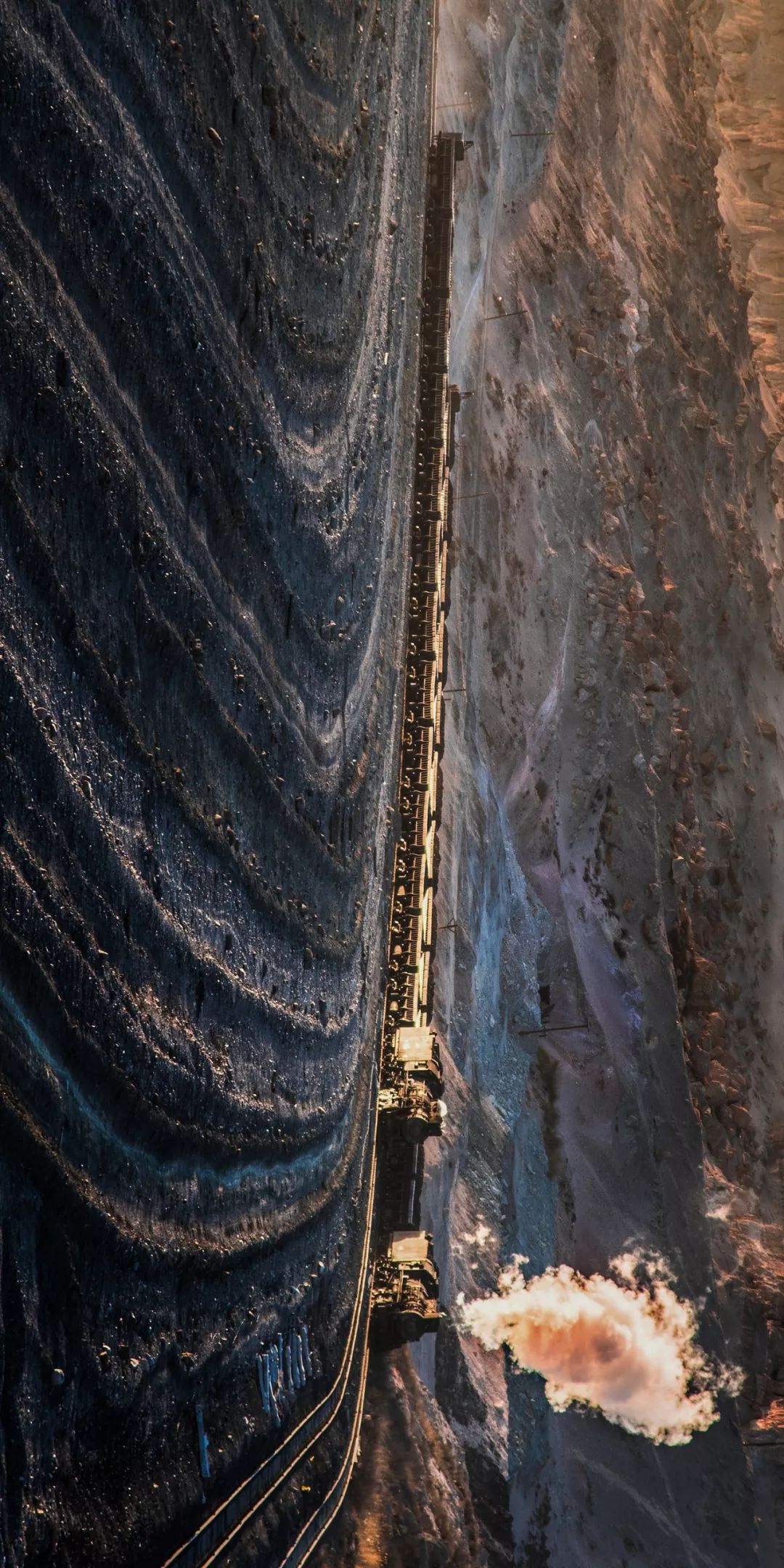 请横屏观看,新疆维吾尔自治区哈密市三道岭煤矿,露天矿坑下煤炭空车和重车的交汇。