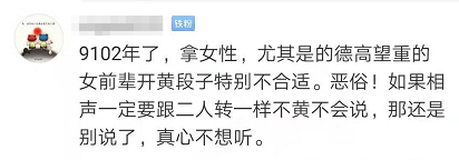 许多网友认为,即便是在说相声,但是拿两位女性长辈抖这种包袱,实在令人气愤。相声演员应该知道什么能说,什么不能说,尤其是如今相声受众范围逐步扩大,更应该注意自己一言一行的影响。