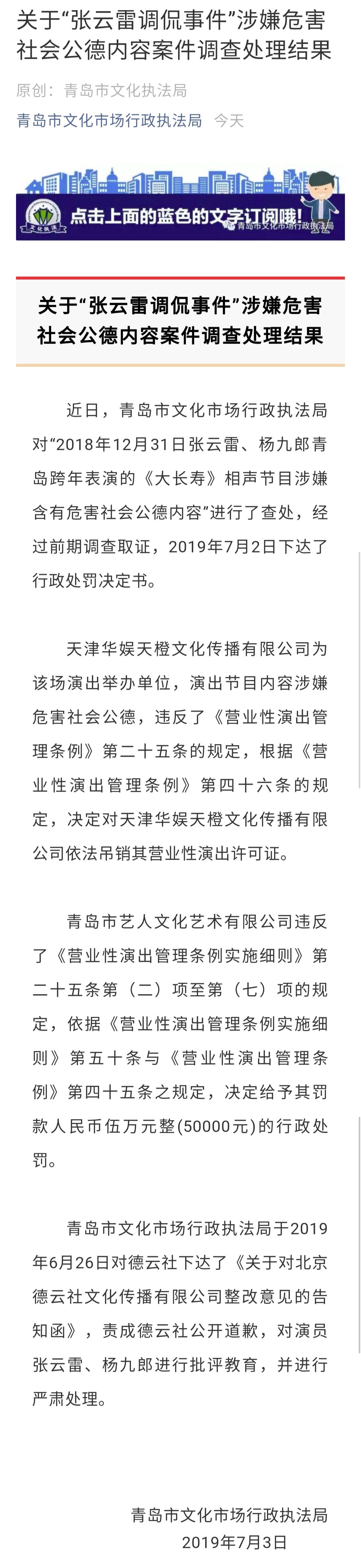 7月3日,青岛市文化市场行政执法局通报调查处理结果: