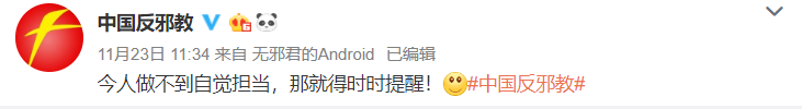 因为“紫光阁”发布这篇推文还@中国反邪教 官方账号,而后者则在昨天转发了自己在5月13日发布的“艺德”贴,并表示,“今人做不到自觉担当,那就得时时提醒!”