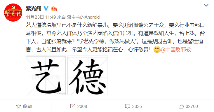 11月23日,“紫光阁”官方账号发文,“怒批”艺人道德滑坡: