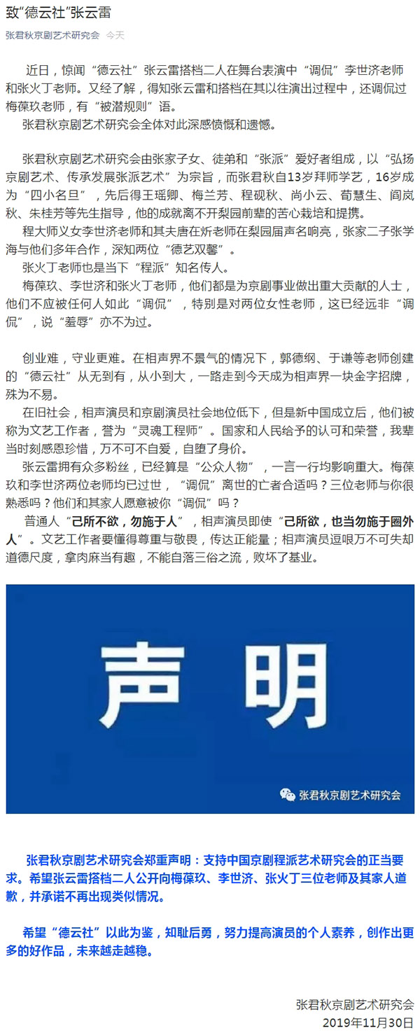 张君秋京剧艺术研究会郑重声明:支持中国京剧程派艺术研究会的正当要求。希望张云雷搭档二人公开向梅葆玖、李世济、张火丁三位老师及其家人道歉,并承诺不再出现类似情况。