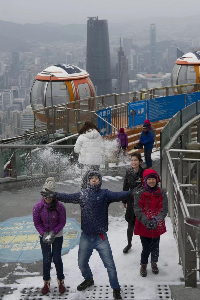 (2016年1月24日市民在广州塔上扬起“积雪”,图片源自@VCG)