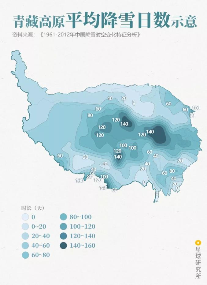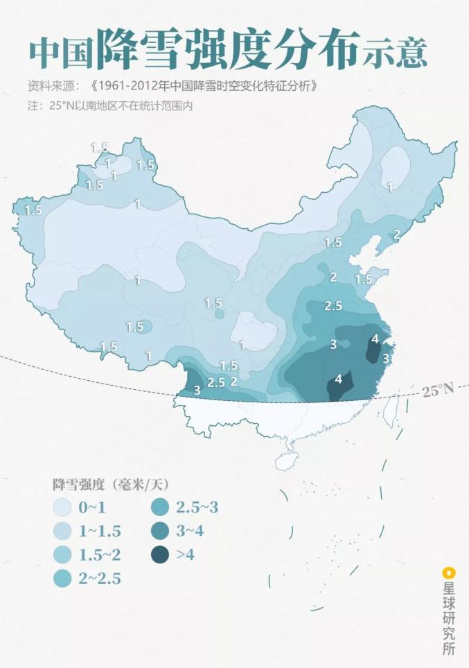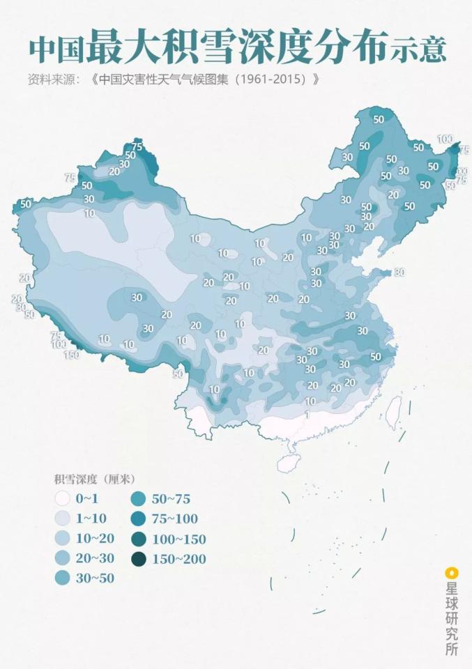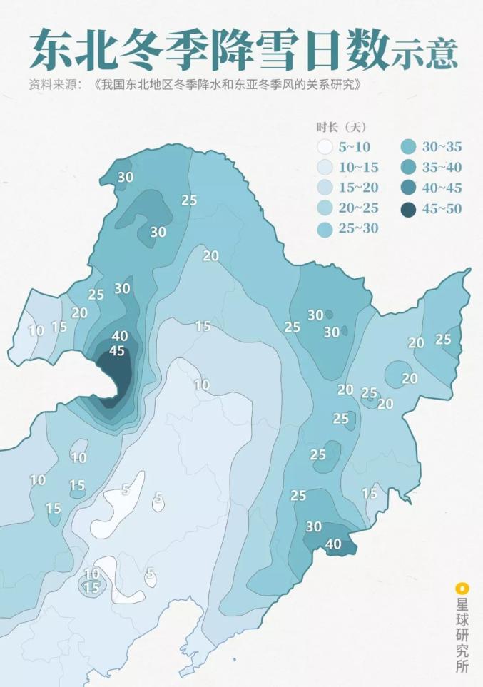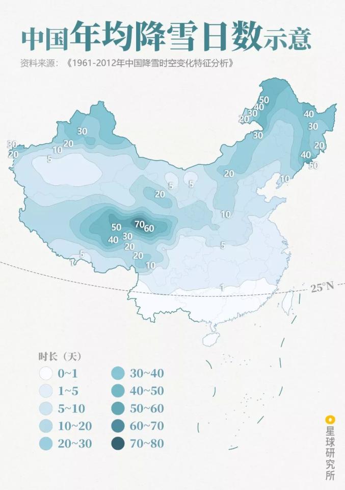 (中国年均降雪日数,不含雨夹雪,制图@郑伯容&巩向杰/星球研究所)