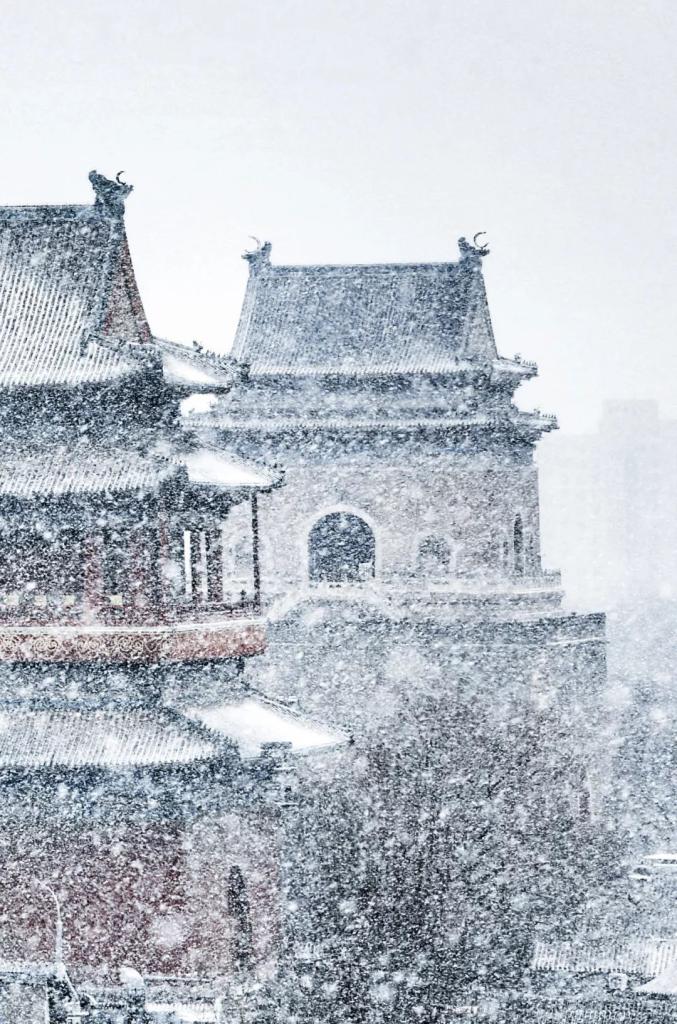 (北京钟鼓楼冬季雪景,诗句出自李白《清平乐·画堂晨起》,摄影师@盛跃)