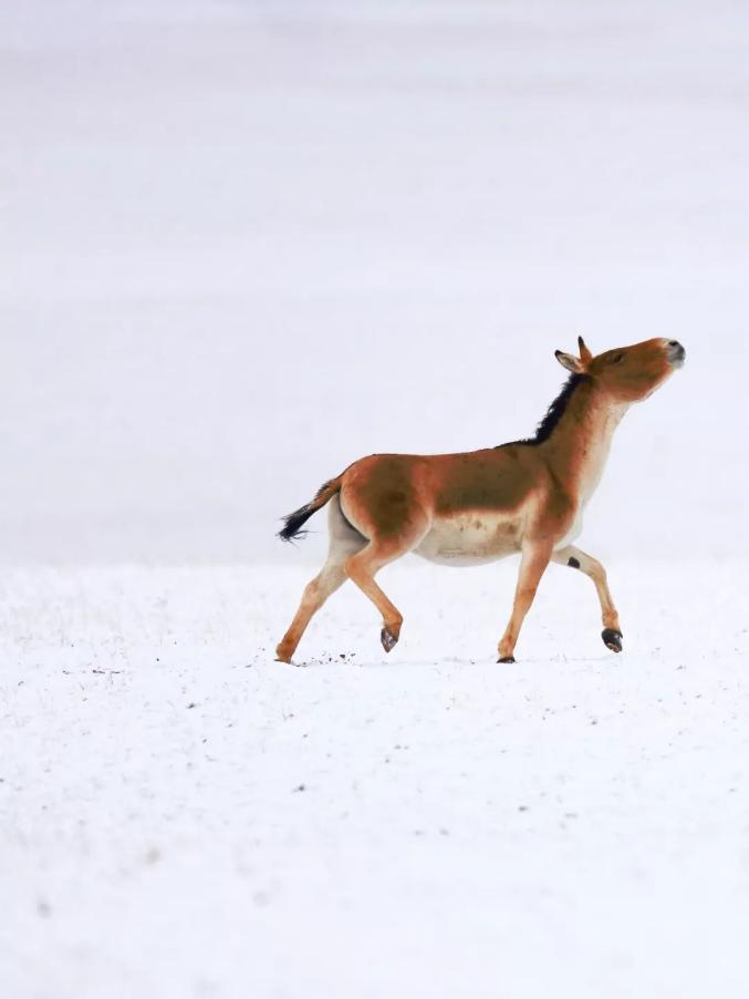 (雪中昂首阔步的藏野驴,摄影师@卡布;上述动物图片为拟人化表达,不代表降雪对动物的生存都是有利的影响)