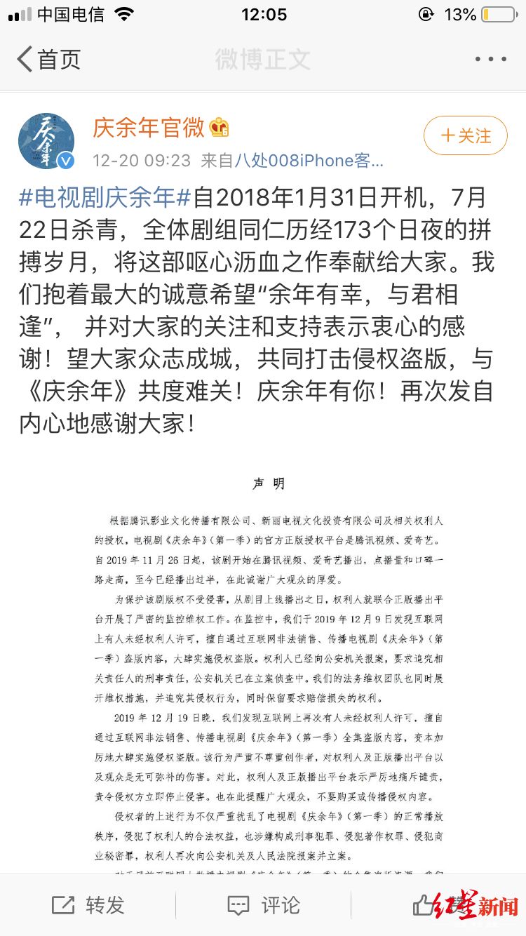 此外,声明呼吁观众,发现不法行为后可通过电视剧《庆余年》官方微博向权利人举报。以支持正版。