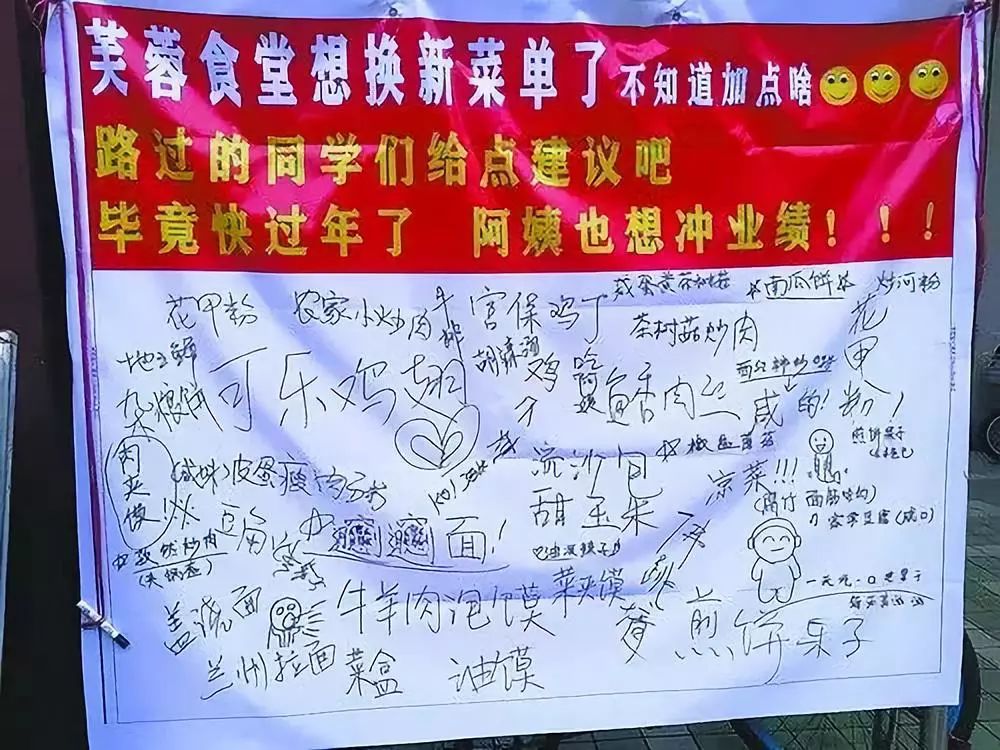 征求意见海报很快就被大家的“心声”淹没了:花甲粉、凉皮、煎饼果子、可乐鸡翅、驴肉火烧……同学们一口气报了169道菜!
