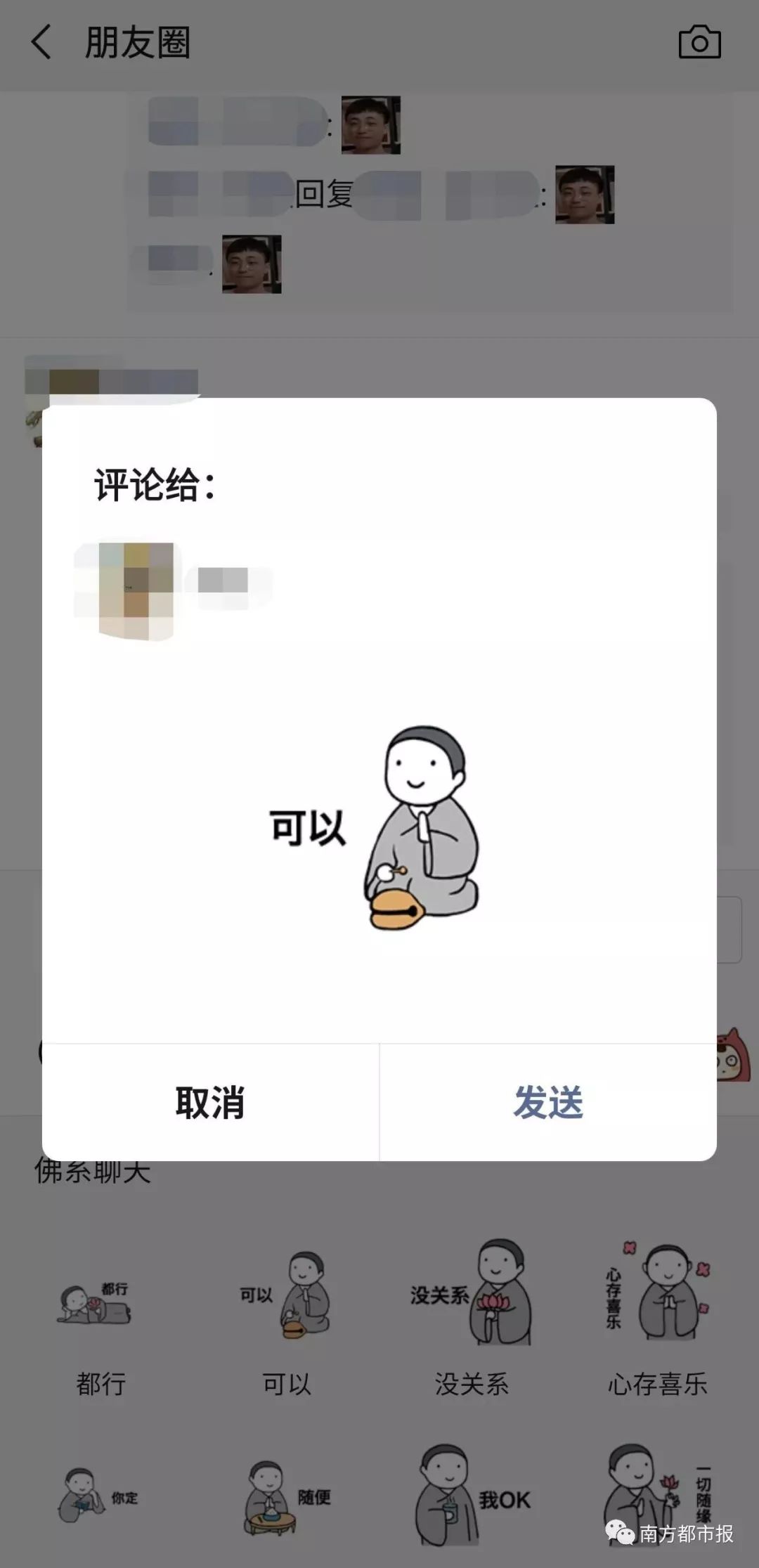 用户在朋友圈点击评论时,可以选择微信中已有的表情包,在发送前有一次确认机会。