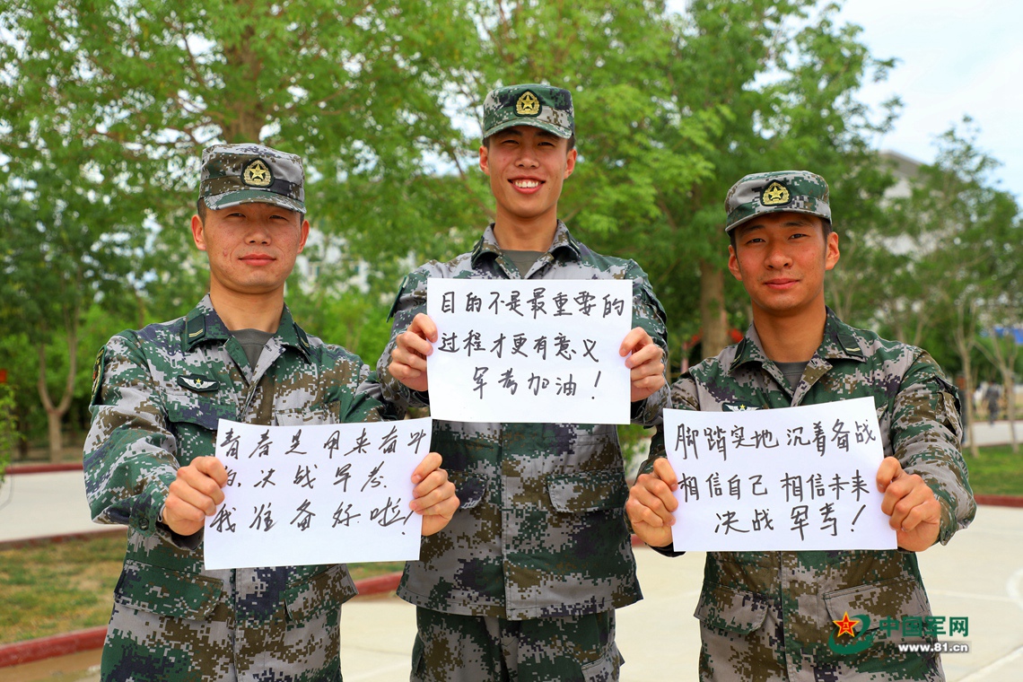 军考不只是一场考试,更是一场对梦的追逐。今年,我们基地参加军考的3名官兵为了“军校梦”夜以继日地奋战复习。为了鼓励他们,7月3日,我邀请3名官兵写下为自己加油助威的话语并为他们拍照,期盼他们能考出好成绩。